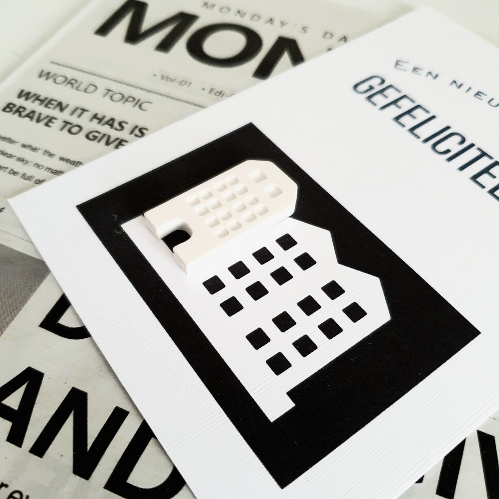 Mooie witte kaart met illustratie en stenen huisje. De kaart voelt en ziet er luxe uit doordat er gebruik is gemaakt van een linnen persing. Bij de envelop wordt een beschermvel voor over de kaart mee geleverd.