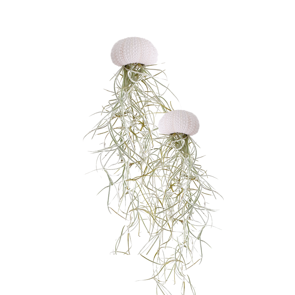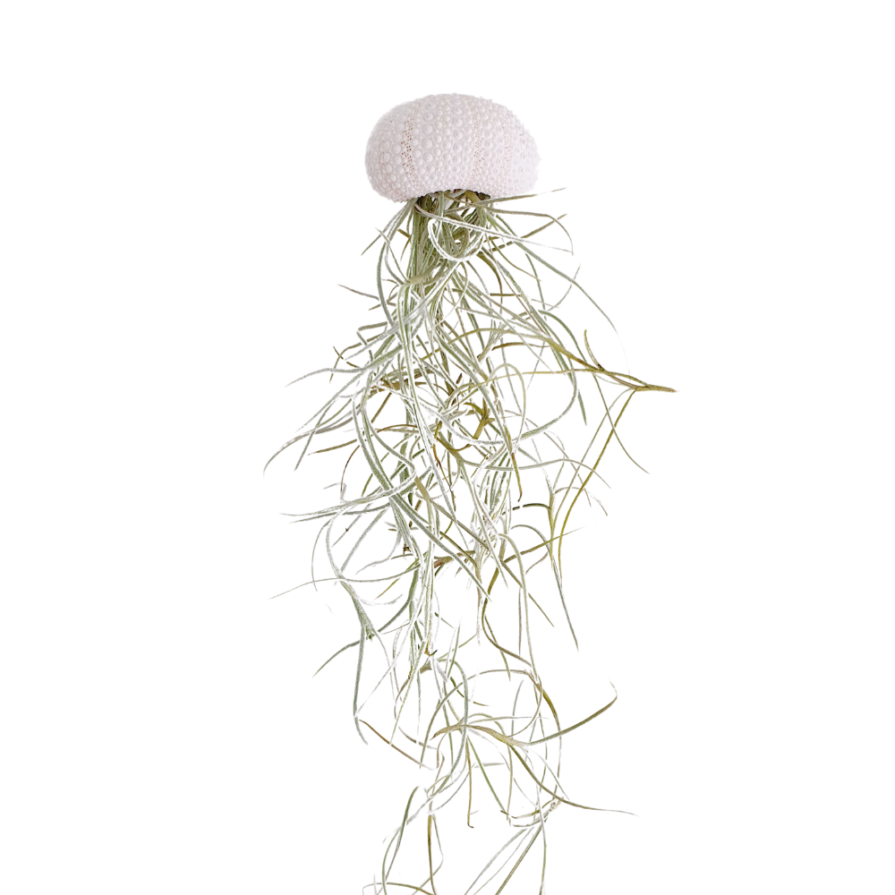How cool are these trendy jellyfish air plants! They resemble jellyfish, but the shell is a real sea urchin shell. The plant hangs from a nylon thread, making it appear as if it's floating. These plants don't need soil and thrive on light, air, and water. A light spray once or twice a week is enough to keep them in top condition. They sometimes appreciate a soaking. Don't submerge the shell, as it will break.