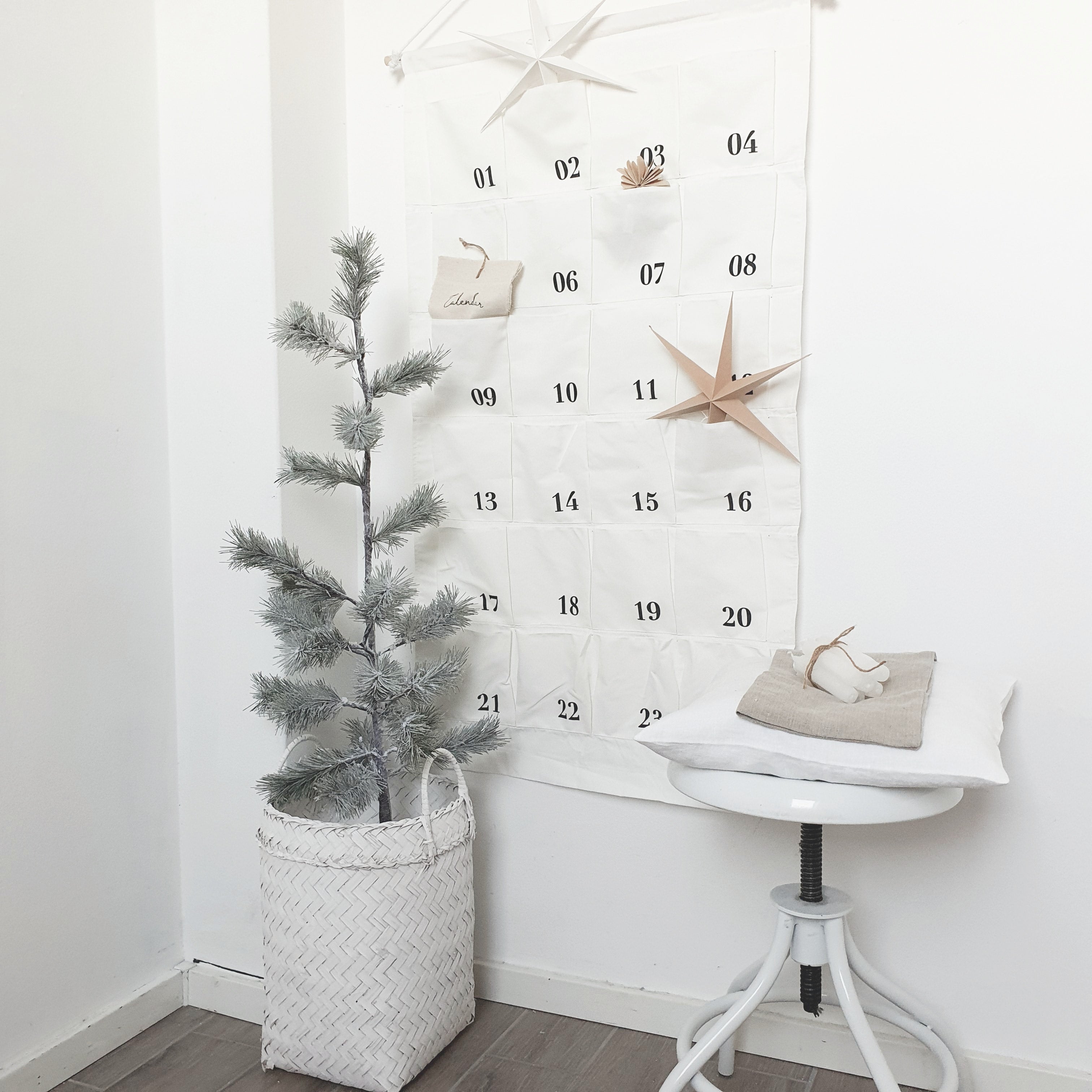 Hele toffe witte adventkalender van canvas stof. Voor elke dag een kadootje of een lief kaartje t/m de kerst. De kalender hangt aan een blank houten stok met een koord. Na de kerst kan je het doek gemakkelijk weer oprollen en wegleggen tot het volgende jaar.