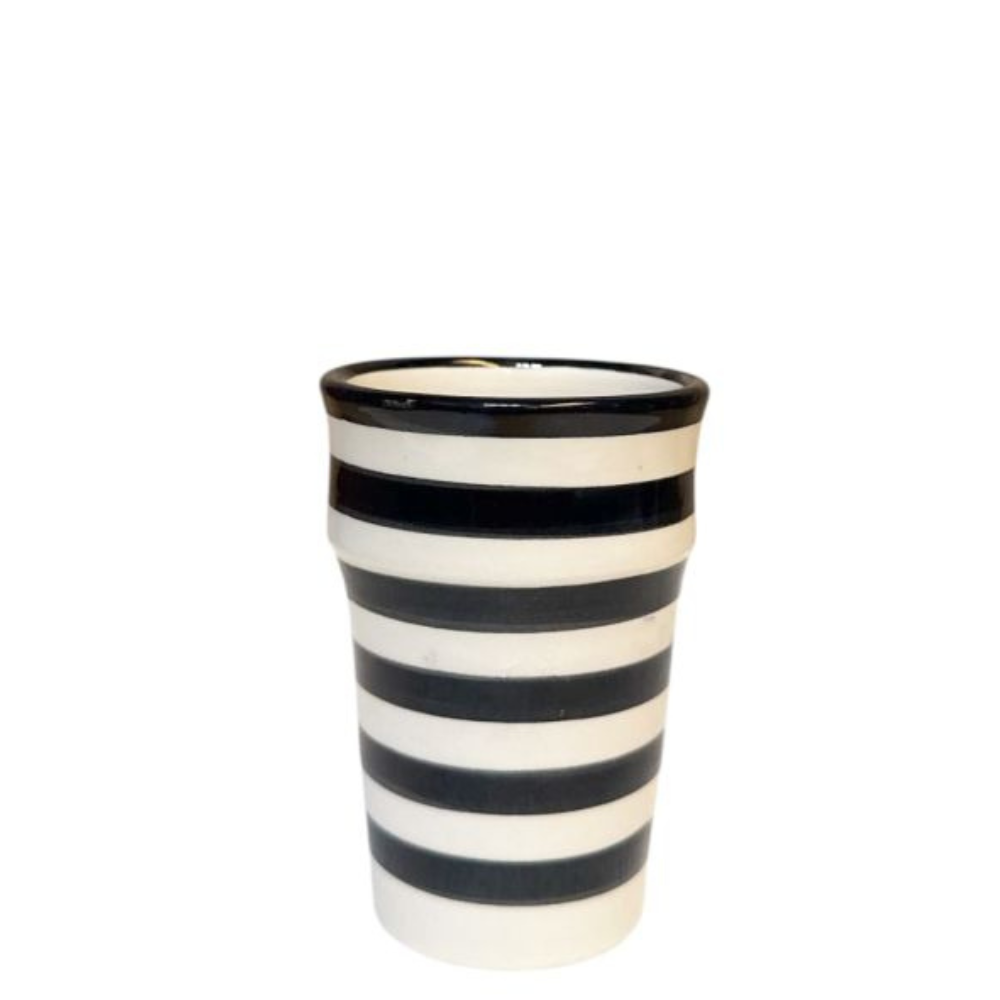 Strak, speels en traditioneel tegelijk – deze handgemaakte Marokkaanse beker met zwart-witte strepen is een opvallende verschijning in elk interieur. Of je nu thee, espresso of koud water serveert, deze compacte beker combineert functionaliteit met een eigentijdse uitstraling.
