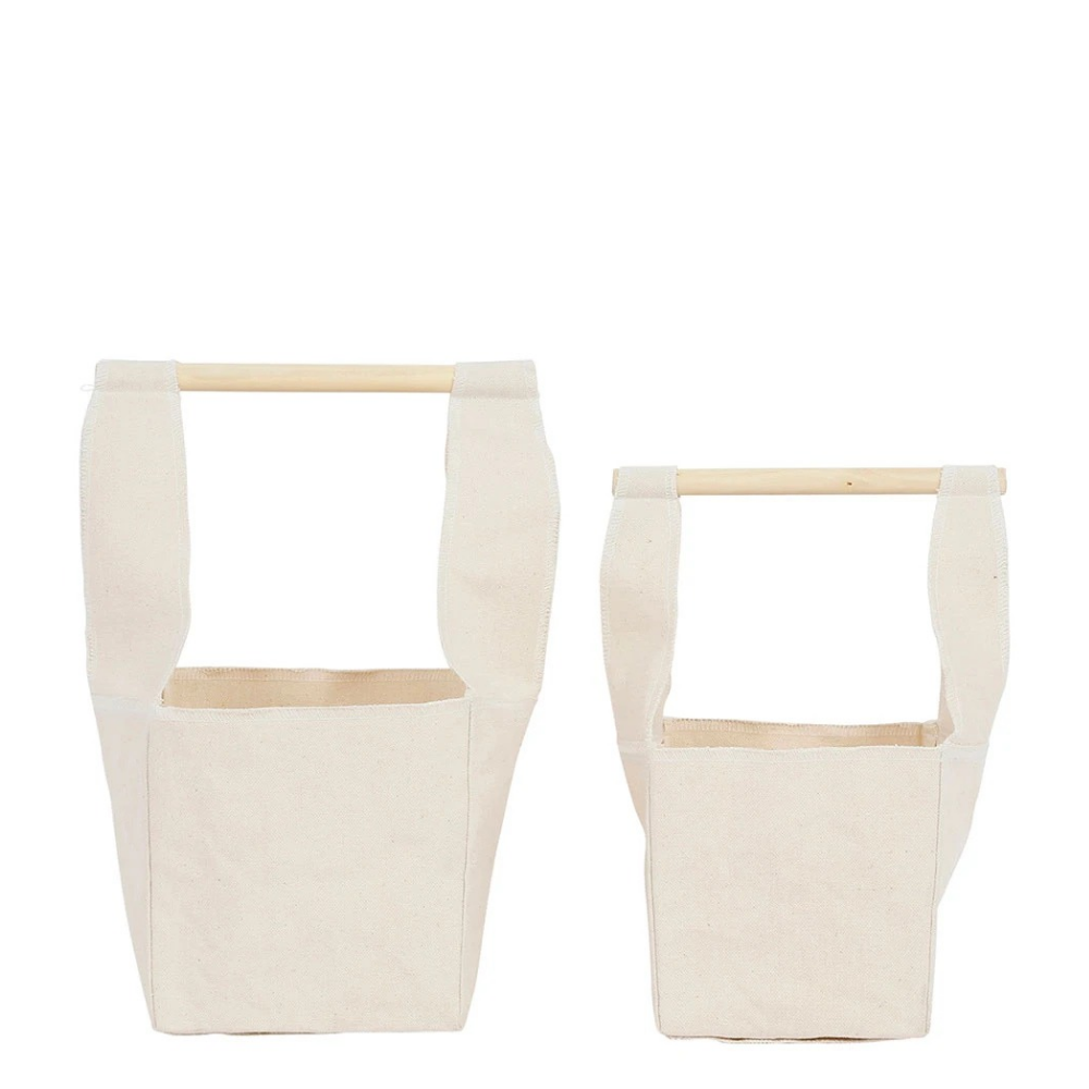 Leuke canvas mandjes met houten hengsel. De mandjes kunnen niet tegen water, dus wel een binnenpotje erin zetten als je er een plantje in wilt zetten.