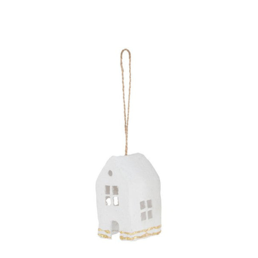Dit zijn prachtige, handgemaakte kersthangers in een subtiel wit-gouden kleurstelling. De eenvoudige, elegante ontwerpen in de vorm van huisjes zijn vervaardigd van katoen en maché, waardoor ze een natuurlijke en warme uitstraling hebben. Deze decoratieve ornamenten zijn een mooie toevoeging aan je kerstboom of kunnen ook op andere plekken in huis worden opgehangen. Ze brengen een gezellige, feestelijke sfeer in huis.