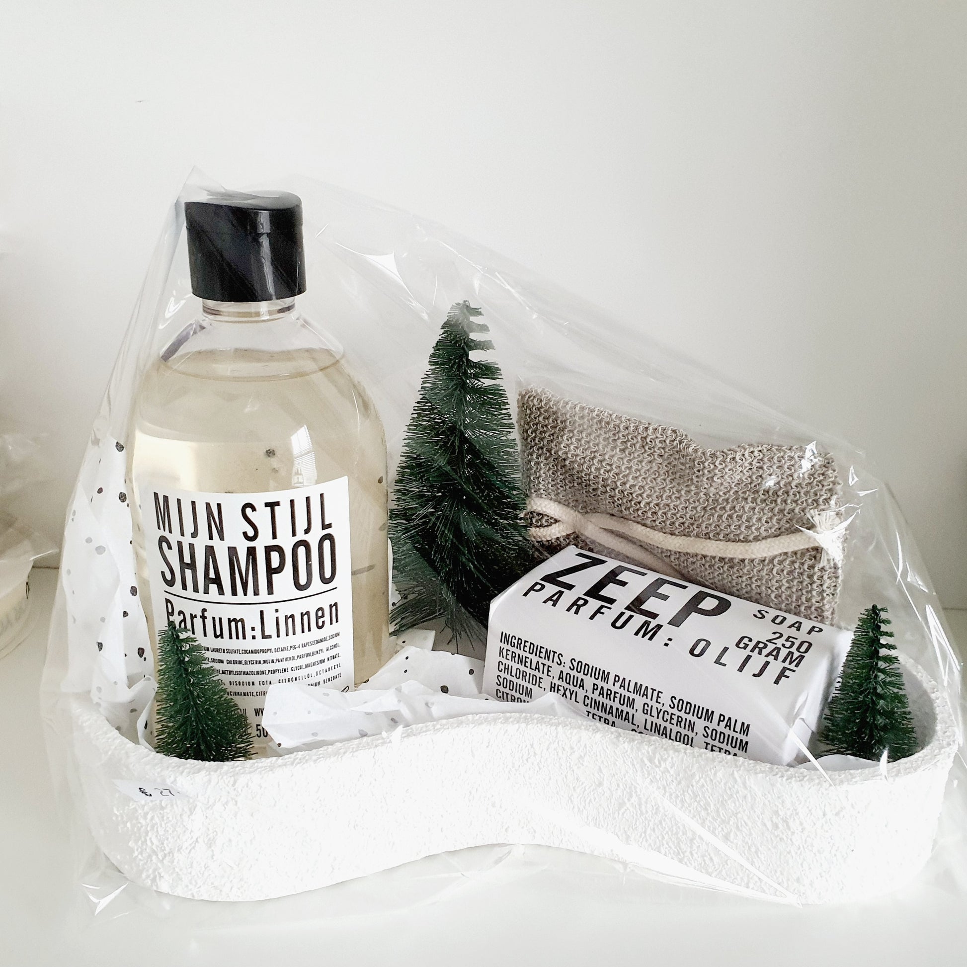- Inhoud: shampoo, zeepblok cotton , linnen zeepzakje en stenen organische schaal met kerstboompje.